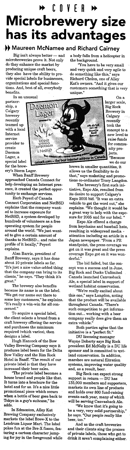 The special occasion Daemon Lager beer, brewed by Banff Brewery for Canada Connect Corporation. Reported by FFWD magazine, a Calgary news and entertainment weekly.