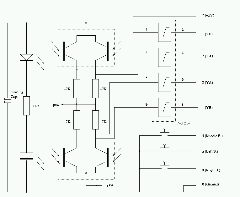 - the mouse movement is flaky - add the extra resistor by soldering it parallel to the existing resistor in the IR-LED circuit. Since the power supply has dropped (from approx. 15V to 5V), the IR-LEDs may not provide enough illumination on the photo transistors.